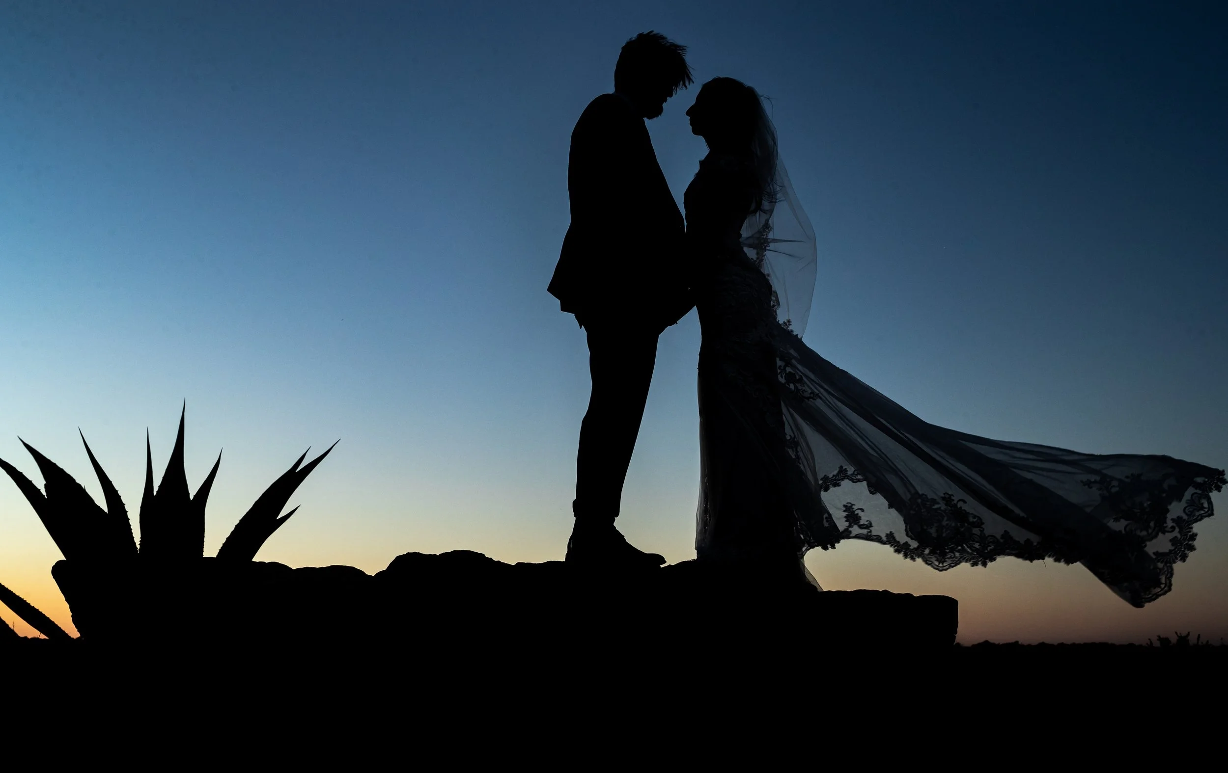 After a long day starting at 8 am, the couple enjoys a moment together as the sunsets. The calm wind of the changing seasons blows the bride’s dress as they take each other in. 10/20/2022 - Aubrey, Texas